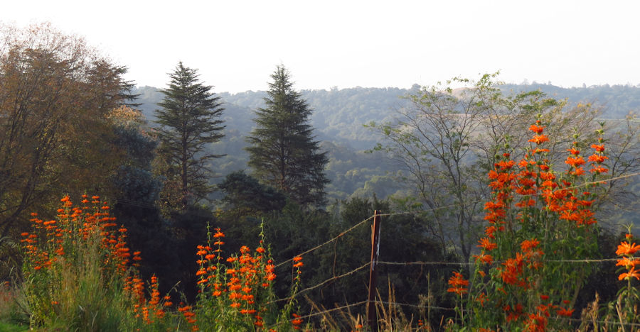 Leonotis leonarus grows up to two metres tall and has vivid orange tubular flowers which develop in compact whorls along the stem, opening at intervals to ensure colour for an extended period. Other members of this family are Leonotis Intermedia with long velvety stems and duller orange flowers in late summer and the daintier Leonotis dubia found in the forests.