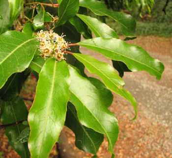 The dark green glossy leaves have shallowly serrated margins, pinkish petioles, and smell faintly of almonds when crushed. The almost insignificant white flowers are scented and followed by small reddish-brown berries which the birds love.