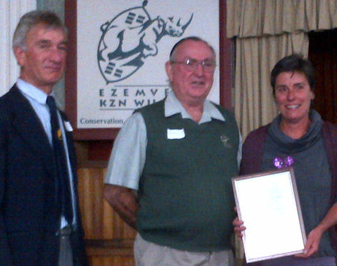 At the recent KZN Conservancies Association AGM, we were surprised to receive a certificate "in recognition of outstanding commitment and contribution to the natural environment of KZN for 30 years". The current Dargle Conservancy was started in 2003, but obviously Ezemvelo still have records dating from the first conservancy started in the 1980's and didn't mind that we were non-existent for a number of years! Nikki Brighton received the certificate on our behalf from Graham Keet (EKZNW) and Malcolm Stainbank (Chair KZNCA).